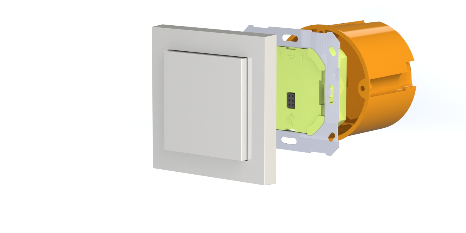 Multifunctional sensor (55 x 55 x 11mm) with sensors for measuring temperature, humidity and brightness in 55 mm size suitable for any standard switch range. Replaceable CR2450R battery. Alternative power supply via frogPlug interface. Including mounting frame for mounting on flush-mounted box.